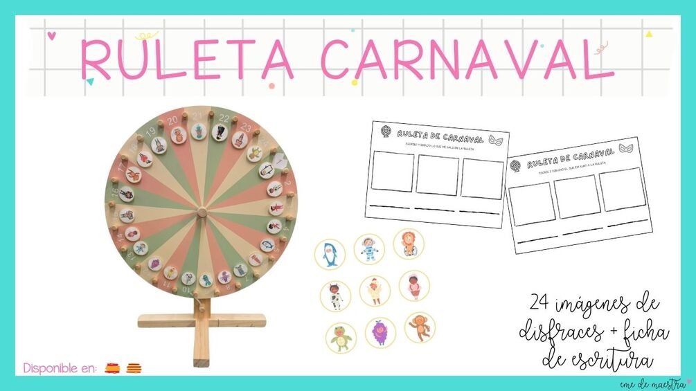 24 imágenes de diferentes disfraces para jugar a la ruleta y una ficha para completar la actividad.